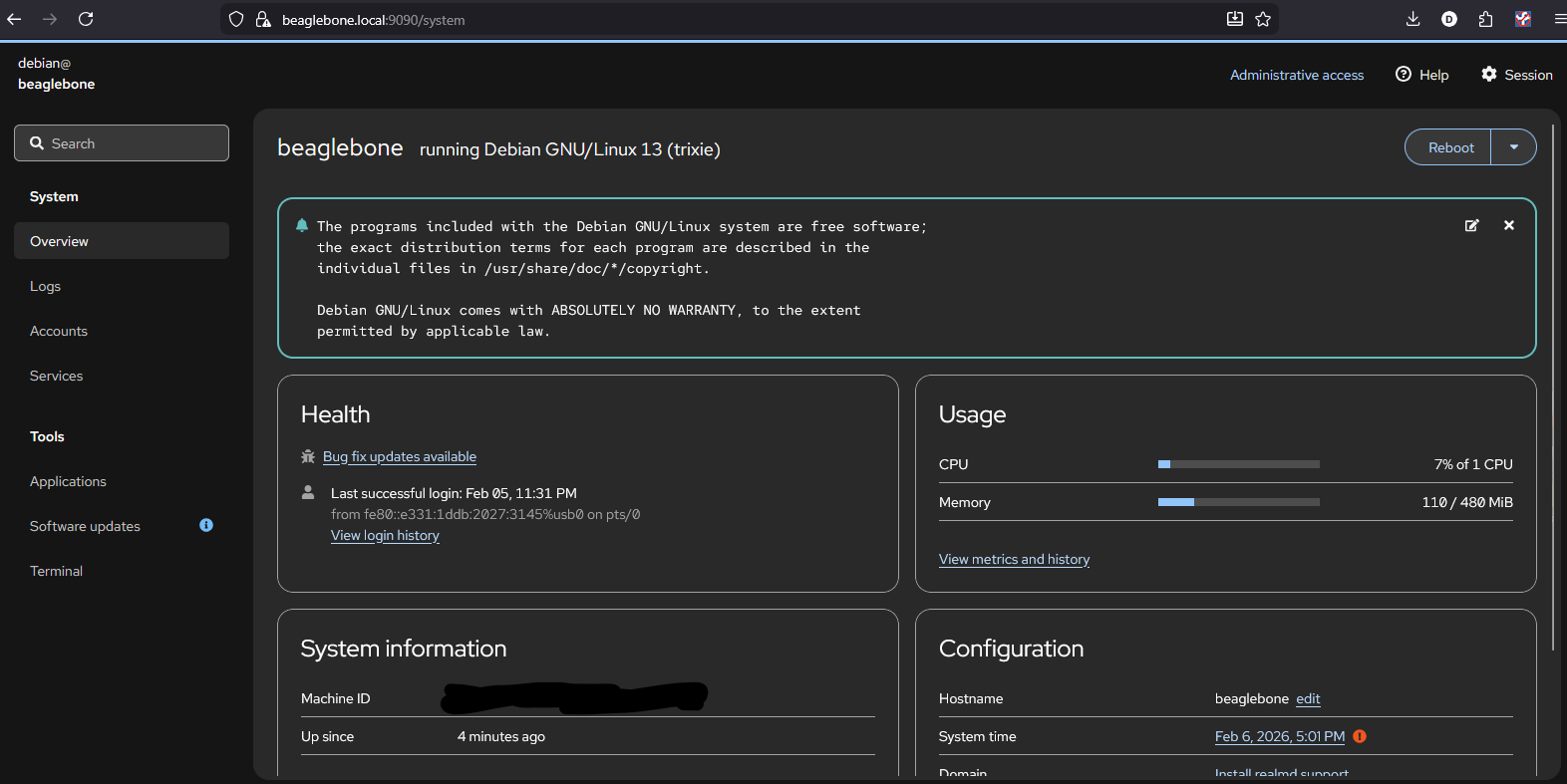 FYI, I had to click past a self signed certificate warning and accept the risk to continue in Mozilla, but the new Cockpit web console is really nice too. I assigned “beaglebone.local” in the image writer rs tool, and have DHCP working.