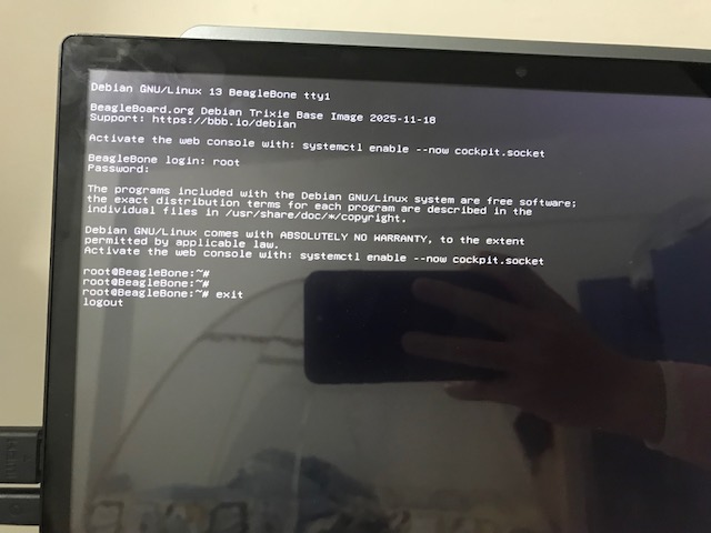 I connected the HDMI to the BBB and was able to log in. However, I discovered that using the exit command causes the system to freeze.
