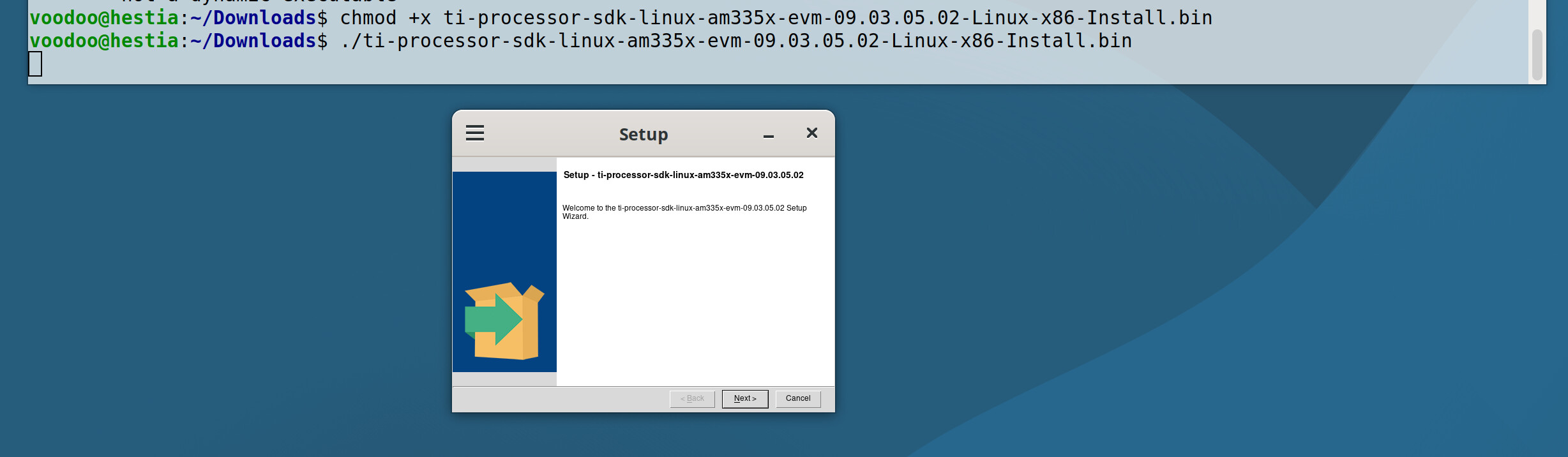 voodoo@hestia:~/Downloads$ chmod +x ti-processor-sdk-linux-am335x-evm-09.03.05.02-Linux-x86-Install.bin