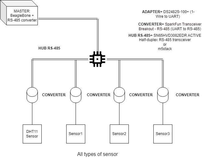 For example, if you use a sensorA (1-Wire) it will have its special converter (1-Wire to RS-485) connected to the HUB.