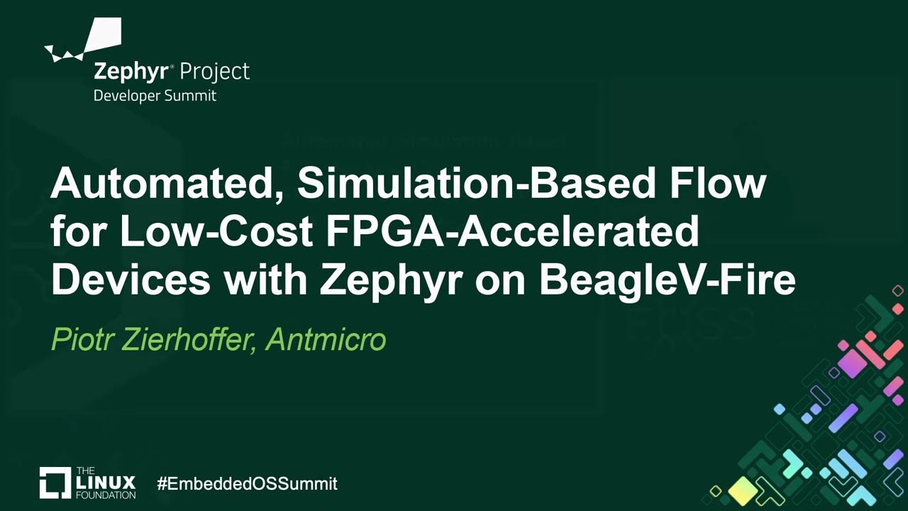 With 4+1 RISC-V cores and a tightly integrated FPGA fabric, the PolarFire SoC is one of the most complex targets supported by Zephyr, used for advanced space, automotive and industrial applications focused on reliability. The recently released BeagleV-Fire from BeagleBoard.org brings this platform at a low cost to a broader audience, letting developers add custom FPGA hardware blocks into real-time systems built with Zephyr for accelerating e.g. motor control, video or AI processing. The talk will describe how the recently contributed Zephyr port for BeagleV-Fire and first-class support for the platform in the Renode simulator, developed in collaboration between Microchip and Antmicro lets you quickly build flexible low-power, high-performance systems with FPGA acceleration. We will show how VS Code and an open source visual design tool called VSD can be used to build and configure a custom peripheral in the FPGA logic, connect it up to Zephyr and generate the necessary firmware, run the entire setup on real hardware and in Renode, with the peripheral co-simulated directly from Verilog/VHDL. An automated live visualization of the simulated platform will also be presented.