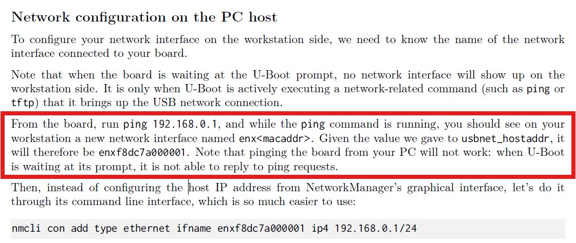 Recent I am playing with my BBB board via these labs. I’m currently stuck at Bootloader - U-Boot/Setting up networking. I have copied the MLO and u-boot.img to SD card and it booted sucessfully to the u-boot prompt.
